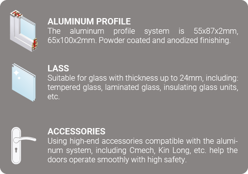 The opening door is assembled with aluminum bars, which can be opened with an angle of nearly 1800. It uses a multi-point locking system and double seal gasket. When closing the door, the multi-point locking system will tightly clamp the door frame and wing together, creating a high level of airtightness and soundproofing and heat insulation capability.